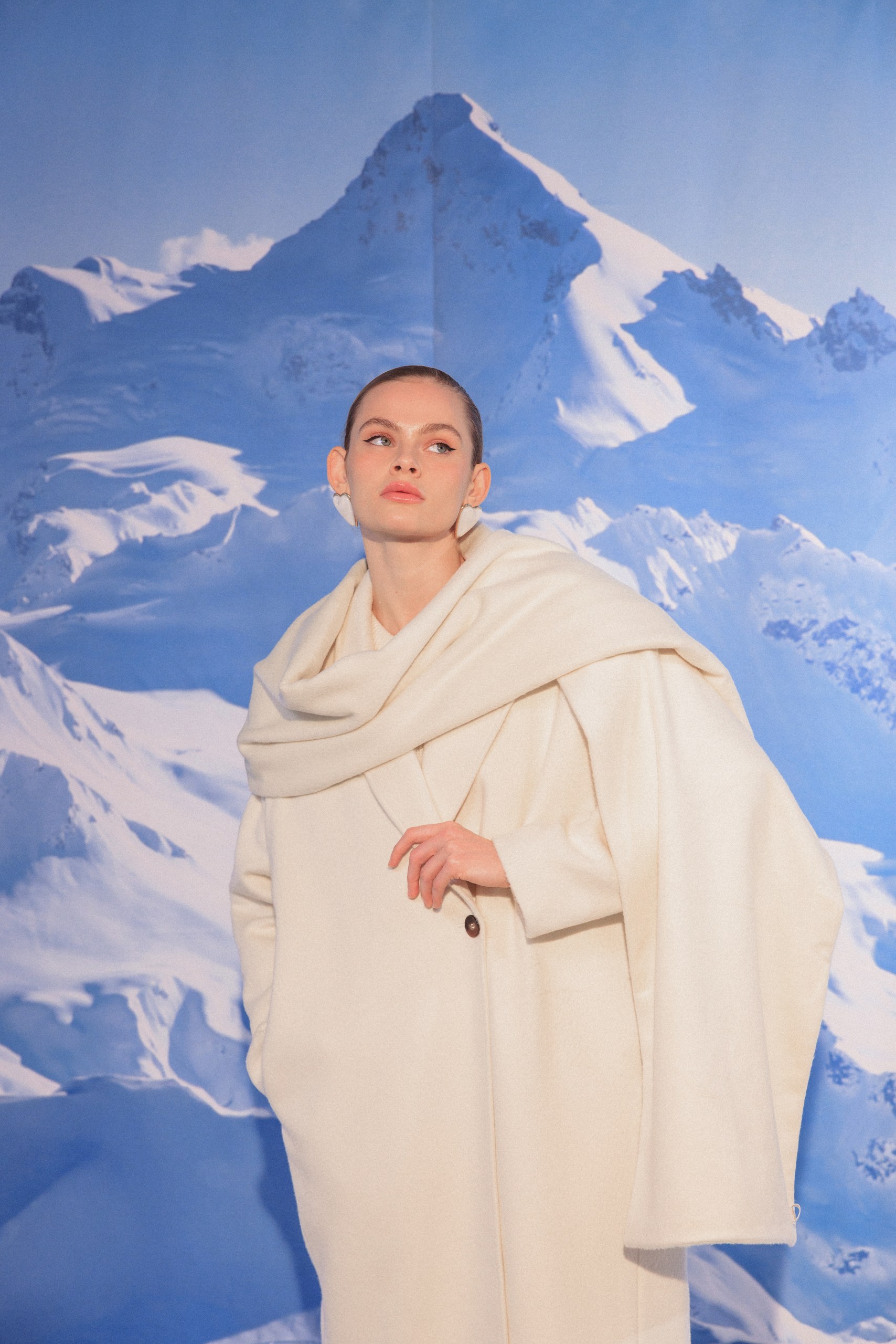 В коллекции переплетаются энергия улиц и уют зимних вечеров: глубокие оттенки burgundy, dream blue и lilak проявляются в вязаных поло First kiss, шерстяные пуховики Cloud touch дарят ощущение лёгкости, а свитера Soft сrush с акцентными рукавами подчеркивают хрупкость и силу одновременно. Укороченные кардиганы Daydream из мериноса, двусторонняя дублёнка из овчины almond milk и пальто из премиальных материалов — шерсти, альпаки и бамбука (модели Elegance, Tenderness и Ballet) — создают образ современной героини, уверенной и женственной. Особое внимание уделено аксессуарам: варежкам, шапкам, панамам, чепчикам и шарфам, которые дополняют зимние образы. Кружевные пуховые платки и митенки, вдохновленные эстетикой «Русских сезонов», добавляют коллекции артистизма и поэтичности.