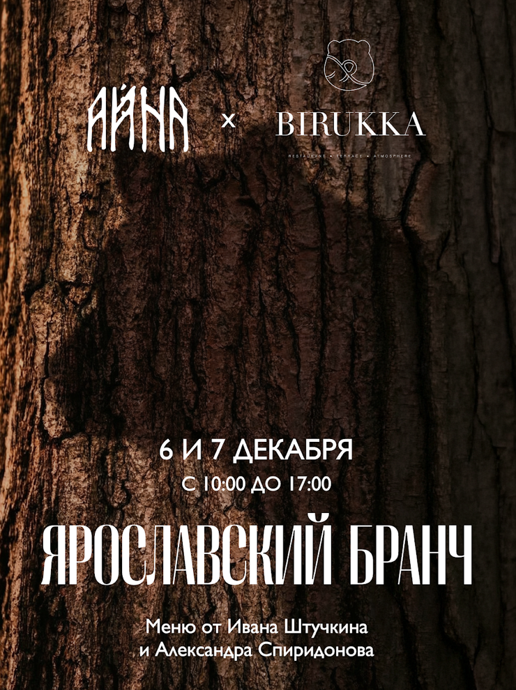 «Айна» продолжает своё гастрономическое путешествие по России и на этих выходных обращается к Ярославлю — городу на Волге, где старинный ритм соединяется с современными вкусами. Партнёром становится ресторан «Бирукка» с его панорамой на центр города и шефом Александром Спиридоновым, который работал от Петербурга до Байкала и прошёл стажировку в норвежском Under Water. Он привозит в Москву спокойную, честную гастрономию, созданную вокруг натурального вкуса продукта. Для бранча Спиридонов приготовил нежную рисовую кашу с топлёным кокосовым молоком (600 ₽), крок-мадам с мортаделлой и сыром бьёрн-трост (900 ₽), насыщенный шницель с кремом из бекона и перечным соусом (900 ₽) и манник в стиле гурьевской каши с кремом из белого шоколада (600 ₽). Шеф «Айны» Иван Штучкин усиливает эту гастрономическую перекличку двумя регионами: овсяной кашей с пошехонским сыром и кремом из трав (600 ₽), котлетами из волжской щуки с мятым картофелем и соусом из зелёного горошка (1 200 ₽), крокетами из рваной говядины с квасным соусом (1 150 ₽) и заварными блинами с брусничным вареньем и мороженым из топлёного молока (750 ₽).