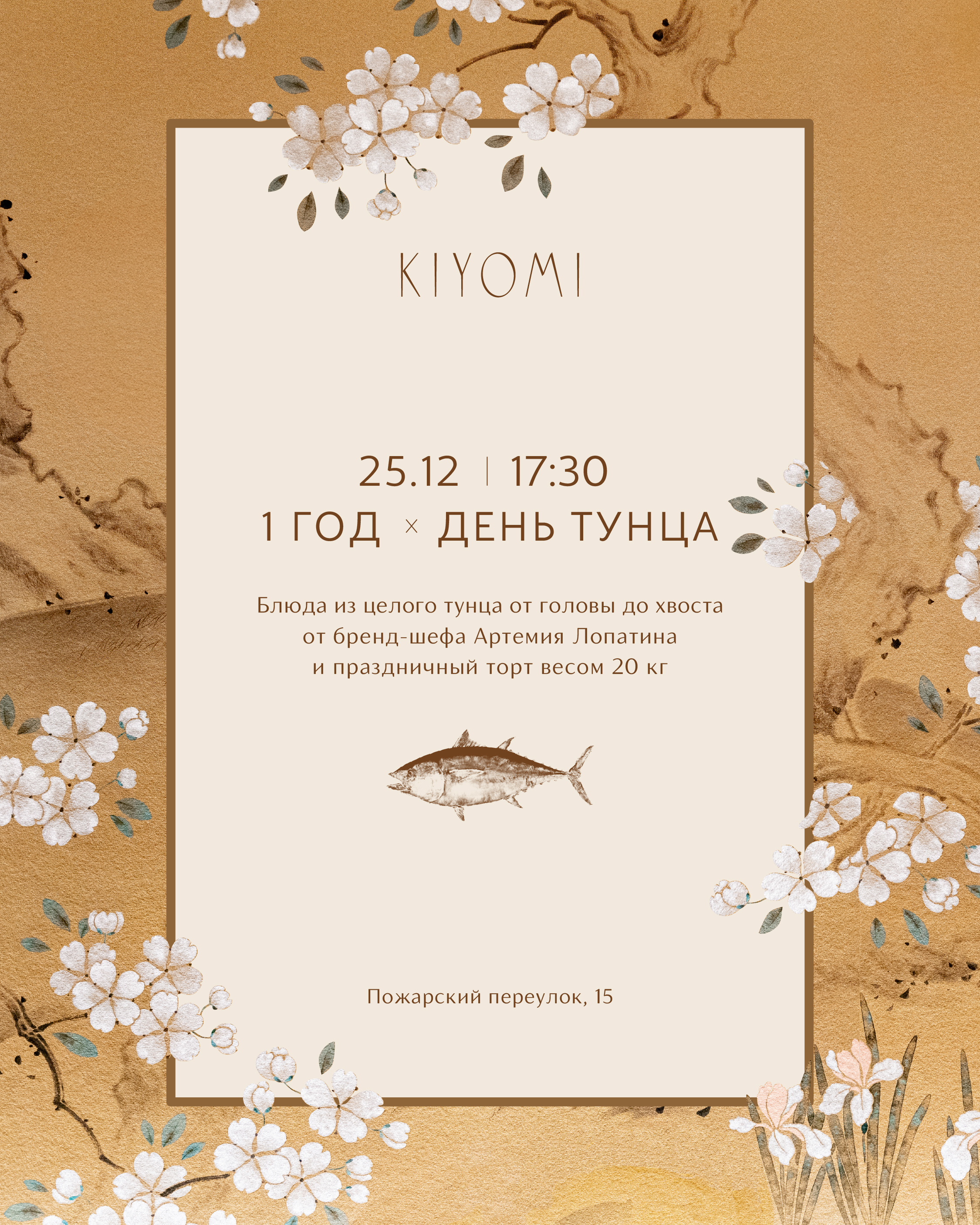 25 декабря ресторан японской кухни Kiyomi отмечает первый день рождения. В честь праздника бренд-шеф Артемий Лопатин проведёт шоу-разделку 100-килограммового тунца, гостей будут угощать саке, игристым и шампанским, а вечером вынесут торт. В special меню представлены шайба из тунца (7 000 руб.), суши из головы тунца (2 000 руб.) и сашими из трёх частей — аками, чу-торо и о-торо (7 500 руб.). Сашими-салат готовят со спинкой тунца аками (5 500 руб.), из брюшка торо — тартар (5 000 руб.), стейк (11 000 руб./100 г), сандо (5 000 руб.) и хендролл с такуаном (2 700 руб.). На горячее — щека тунца на гриле (48 000 руб.).