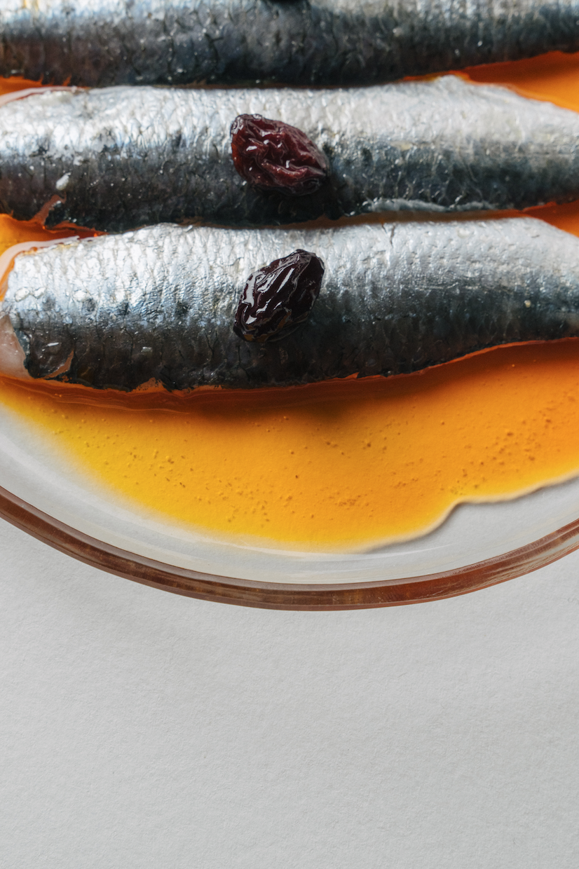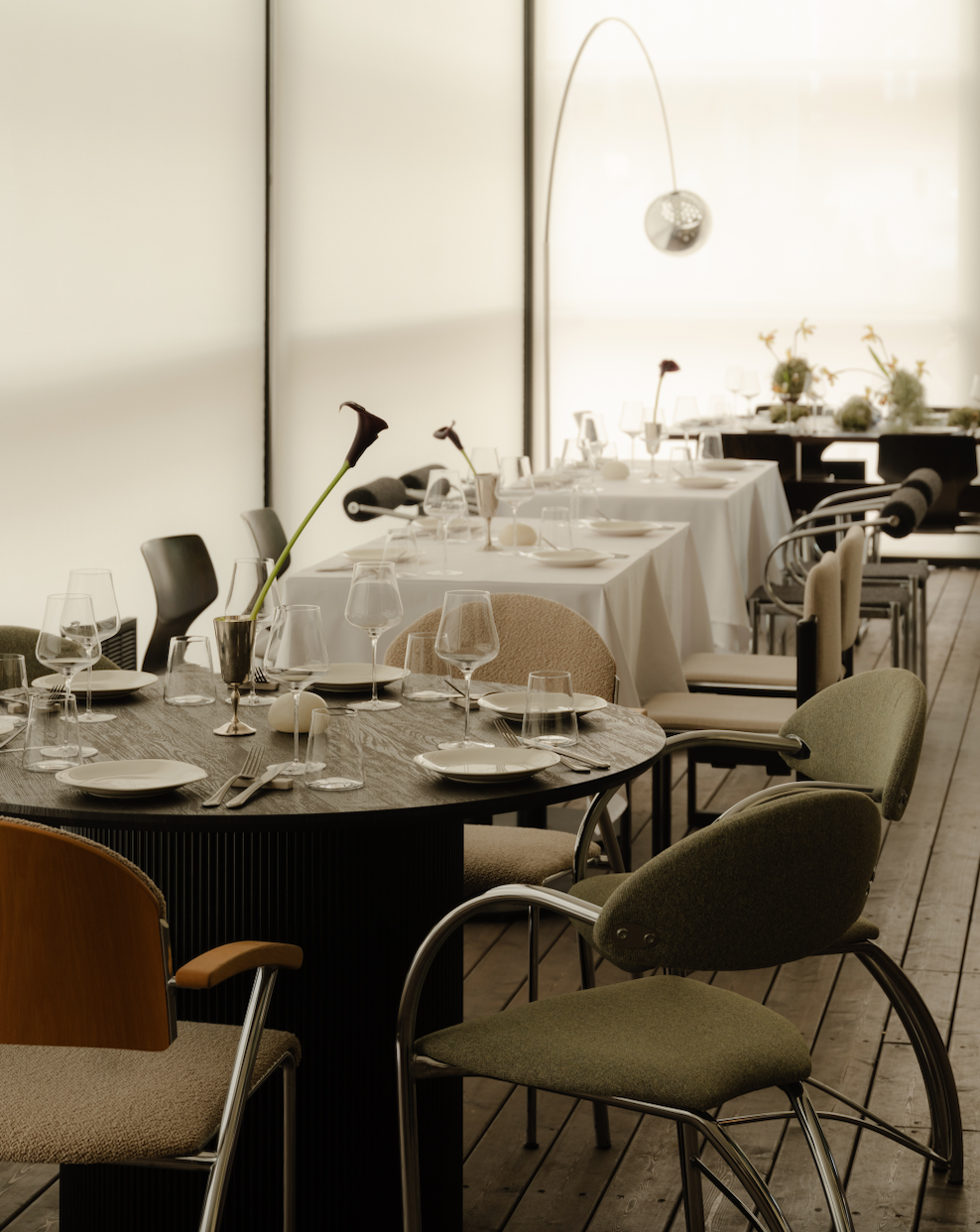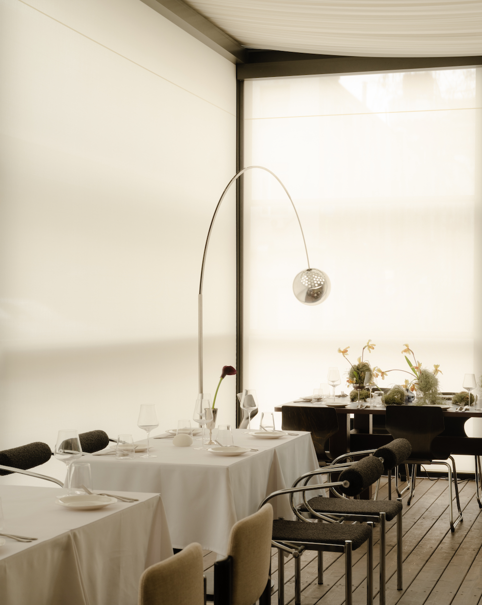 Пространство построено на ассоциациях с морем. Под потолком — лёгкие тканевые полотна, напоминающие паруса, на полу — доска, словно палуба или пирс, в гардеробе шторы переливаются, как рыбья чешуя. Гостям вместо номерка выдают настоящую ракушку — акцентную деталь, созданную в коллаборации с ювелиром и дизайнером Александром Карпинским. Внутренний мир ресторана сформировался благодаря Валерии Сергеевой: винтажные предметы, найденные на рынках Испании, Италии и Франции, добавили пространству глубины и подлинности. Холодный металл и тёплое дерево, строгие формы и живые фактуры создают баланс, который располагает к замедлению — даже в центре города.