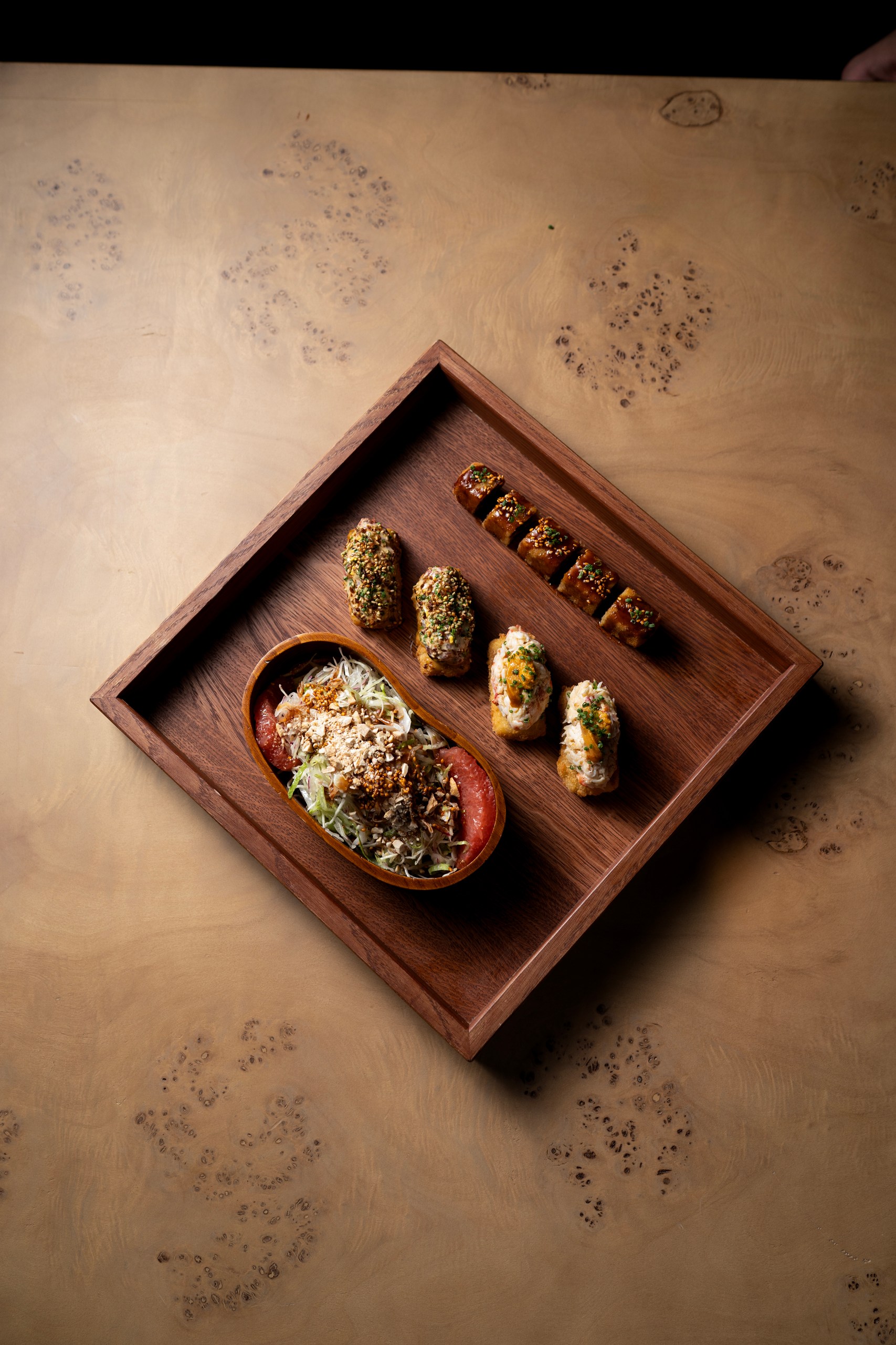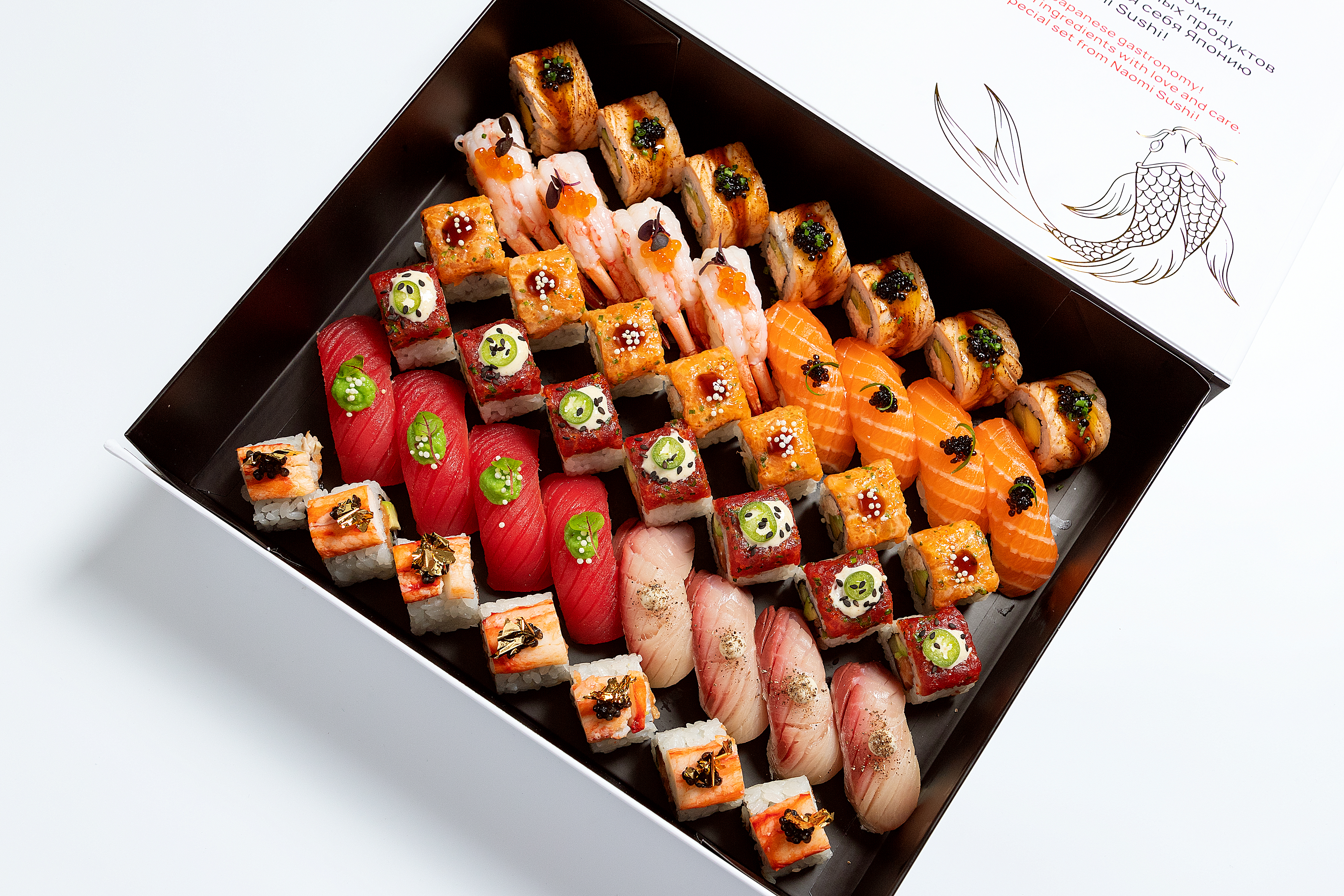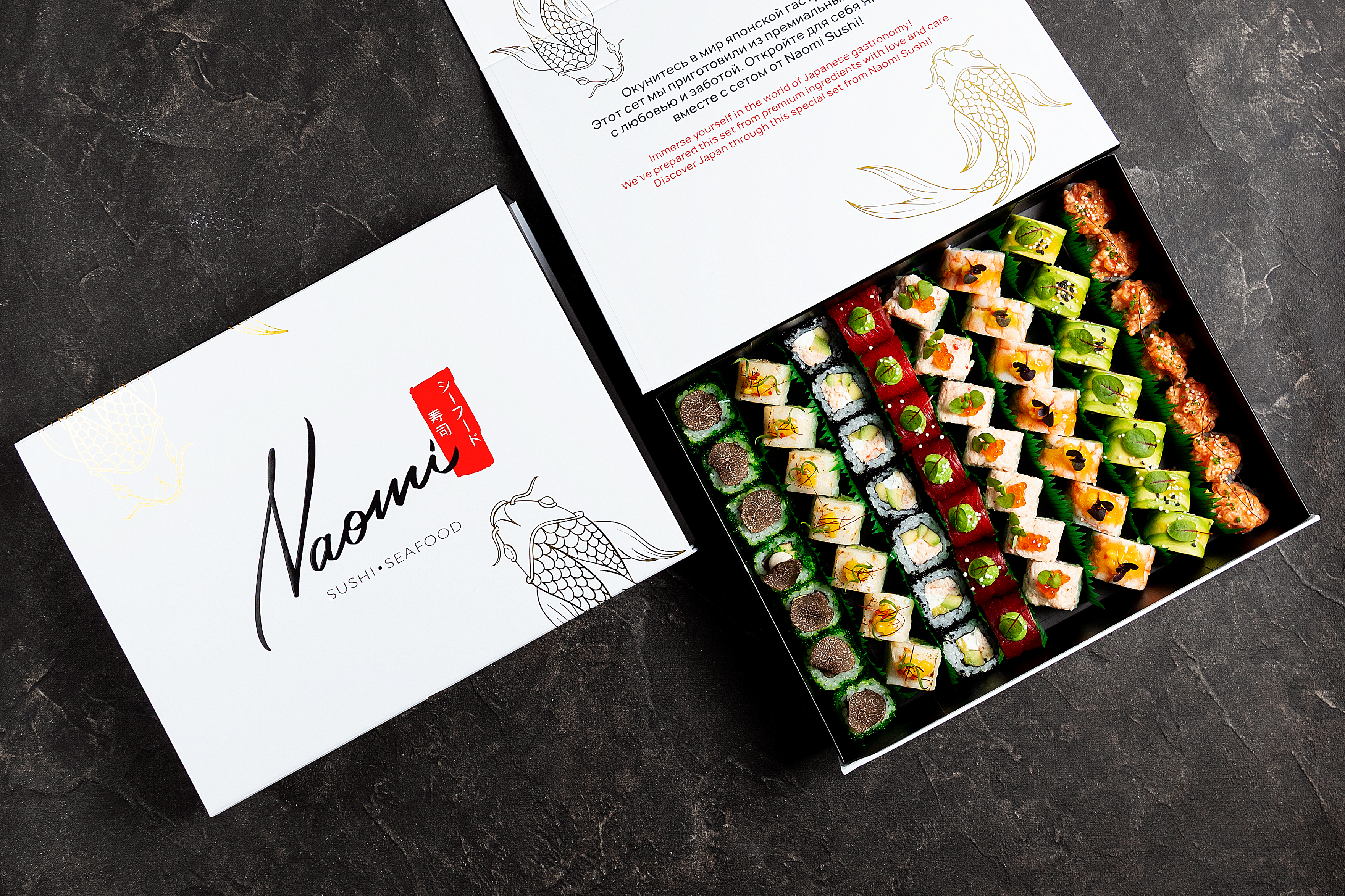 В Naomi Sushi появились новые спешл-сеты, созданные для истинных ценителей суши. Шеф-повар Олег Шин тщательно подбирал ингредиенты несколько месяцев, чтобы достичь идеального баланса вкусов. Каждый сет выполнен из премиальных продуктов и стильно упакован. Special Set N1 (23 500 ₽) включает пять видов суши по 8 штук: блюфин с черной икрой и золотом, торо с трюфелем, брюшко лакедры с имбирем и зеленым луком, лосось с красной икрой и гребешок с трюфелем. Special Set N2 (17 900 ₽) сочетает сашими (тунец блюфин, лакедра, лосось, торо) и по два суши каждого из следующих видов: фаланга краба, гребешок, лосось с трюфельным крабом, тунец с трюфельным лососем, краб-трюфель, угорь и острый тунец. Special Set N3 (15 900 ₽) ориентирован на любителей роллов: тунец-трюфель, краб-манго, ролл из двух видов тунца, опаленный с гребешком, «Филадельфия» с креветкой, острый с лососем, хрустящий угорь с авокадо, а также трюфельный краб с лососем и зеленым сыром. Special Set N4 (18 700 ₽) включает сашими-ролл с тунцом и сибасом, сашими-ролл с лососем и острым крабом, а также роллы с крабом и фуа-гра, «Красный дракон», хрустящая креветка с крабом и ролл с тунцом, черной икрой и опаленным торо. Special Set N5 (17 900 ₽) предлагает роллы с фалангой краба и черной икрой, ролл тар-тар тунец с лососем, ролл с трюфельным крабом и опаленным лососем, ролл тар-тар лосось с крабом, а также четыре суши: сладкая креветка, лосось, тунец еллоуфин и лакедра.