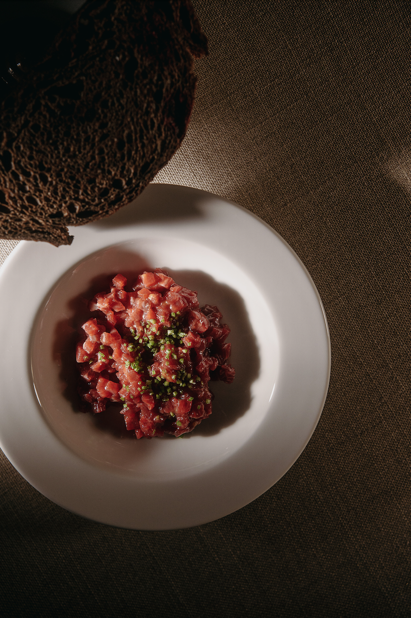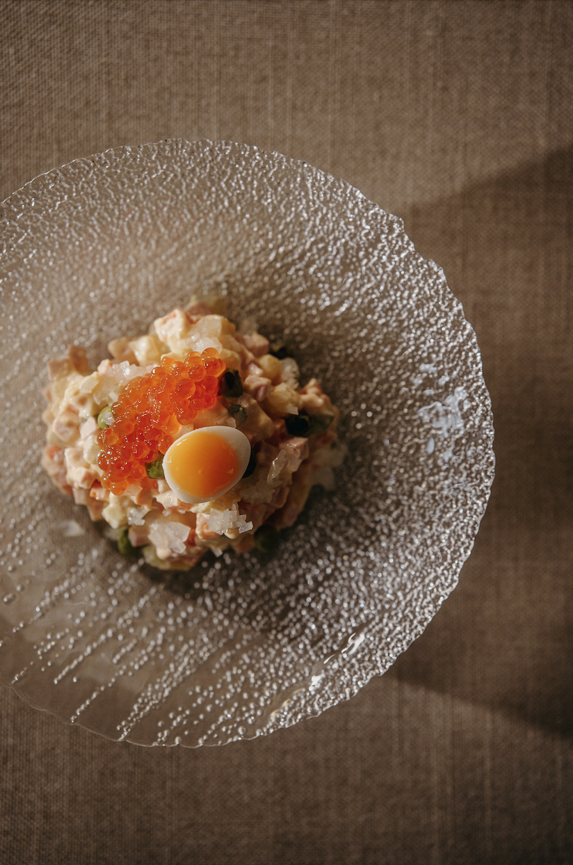 Меню ОКН строится на локальных продуктах и сезонности, представляя знакомые символы прошлого через авторское прочтение. Среди закусок — сибирская чушь из двух видов рыбы с томатной водой, анчоусом и ферментированным лимоном (1200 руб.), свекла в винно-вишневой редукции с сыровяленой уткой и козьим сыром (680 руб.) и карельская форель в пепле с малосольным огурцом (1100 руб.). В супах — борщ с томленой говядиной и смальцем (790 руб.) и грибная похлебка (740 руб.) с водорослями и лесными грибами. Основные блюда включают фаршированный перец с луковым соусом (1200 руб.), полбу с говяжьим языком и бородинской крошкой (1390 руб.), мясной пирог с костным мозгом (1500 руб.) и окорочок цыпленка с картофельным пюре, куриным жу и жареным кейлом (990 руб.). Десерты Ирины Леочко основаны на воспоминаниях о детстве и нотках баловства: ромовая баба с апельсиновым сиропом и ванилью (680 руб.), гречка с творогом в виде попкорна с муссом из творога и соленой карамелью (780 руб.), десерт из бородинского хлеба с меренгой и мороженым из печёного картофеля (870 руб.) и груша с мороженым из сыра «Косичка» (890 руб.), подаваемая с хрустящей крошкой, черным перцем и кориандром.