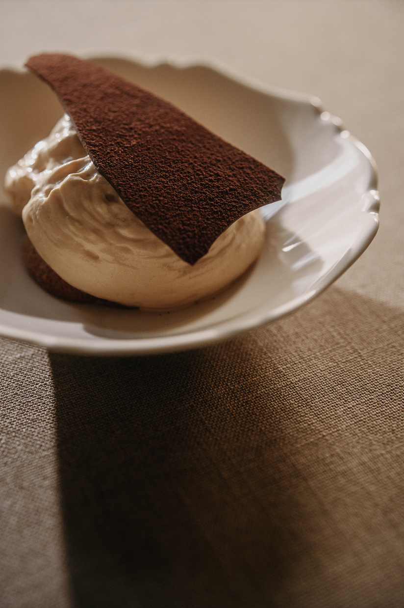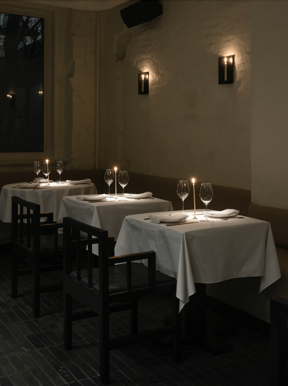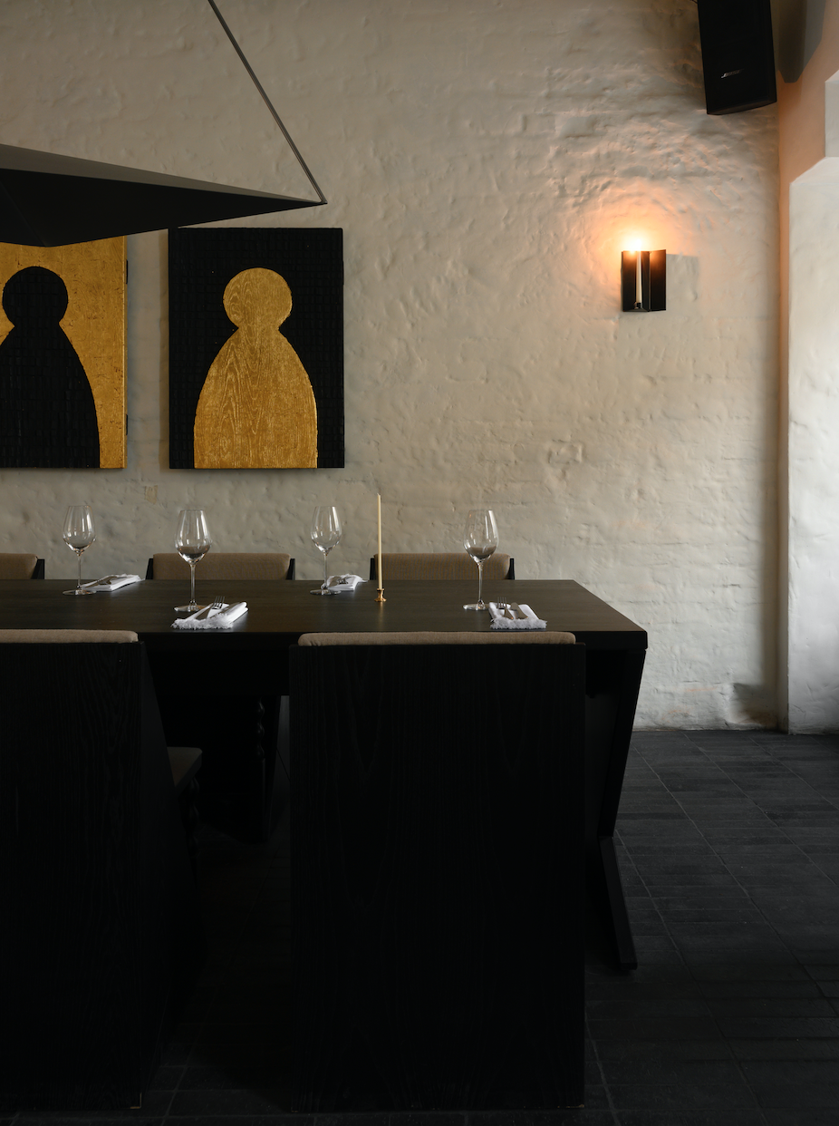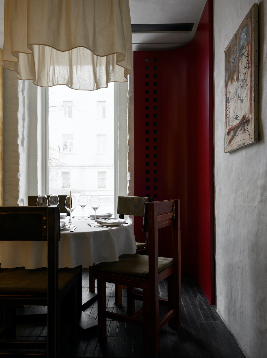 Интерьер и визуальный язык ресторана отражают размышления о современной русской архитектуре и культурной памяти. В пространстве присутствуют золотая поталь, «Алтарь», брусчатка из петербургского двора, белая мазанка на стенах, фигурная черепица «лемех», а также уникальная входная группа и стулья работы Матвея Шапиро. Форма и материалы здесь создаются в процессе работы, соединяя эстетику авангарда, архивные находки и современные детали, делая интерьер первой точкой контакта гостя с философией проекта.