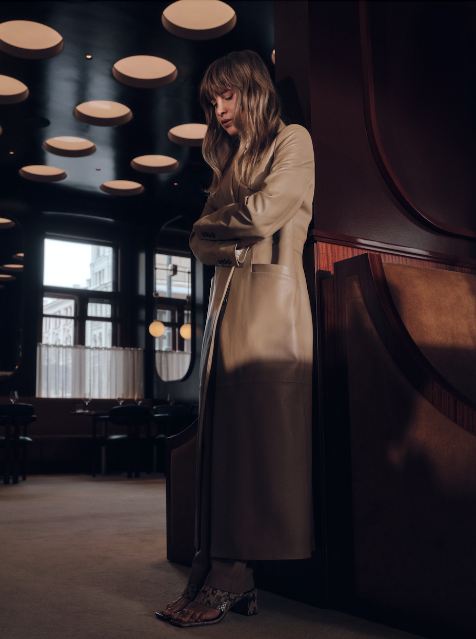 Помимо кожи, в капсулу вошли модели из текстиля. Брючный костюм Mirage из купро и вискозы меняет оттенки в зависимости от освещения, создавая ощущение глубины и лёгкой иллюзорности формы. Тренч Cherbourg из плотного твила с шерстью дополнен влагозащитной пропиткой и легко интегрируется в гардероб благодаря классическому крою и универсальной длине. Палитра GI построена на природных оттенках — бледно-коралловом, карамельном, кофе с молоком, серо-бежевом, пепельном и чёрном. Эти цвета подчёркивают фактуру материалов и сочетаются между собой, формируя цельный и продуманный гардероб.