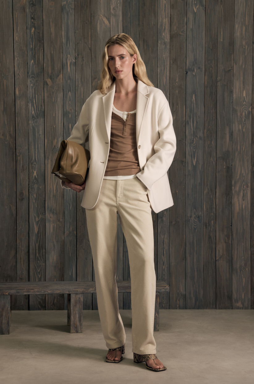 В женской линии для ранней весны представлены изделия из натуральной кожи в бежевой гамме — платья длины миди, а также комплекты с топом, юбкой или брюками из мягкой кожи ягненка. Эти модели формируют хрупкий и утонченный образ и подходят как для деловой встречи, так и для выхода в свет или ужина в ресторане. В мужской части коллекции альтернативой классическому костюму стал комплект из гладкой шерсти. Архитектурный силуэт и комфортная посадка позволяют провести в нем весь день — от утренних встреч до вечернего ужина. В сочетании с поло из шелка и хлопка образ приобретает более свободное звучание, сохраняя при этом статусность.