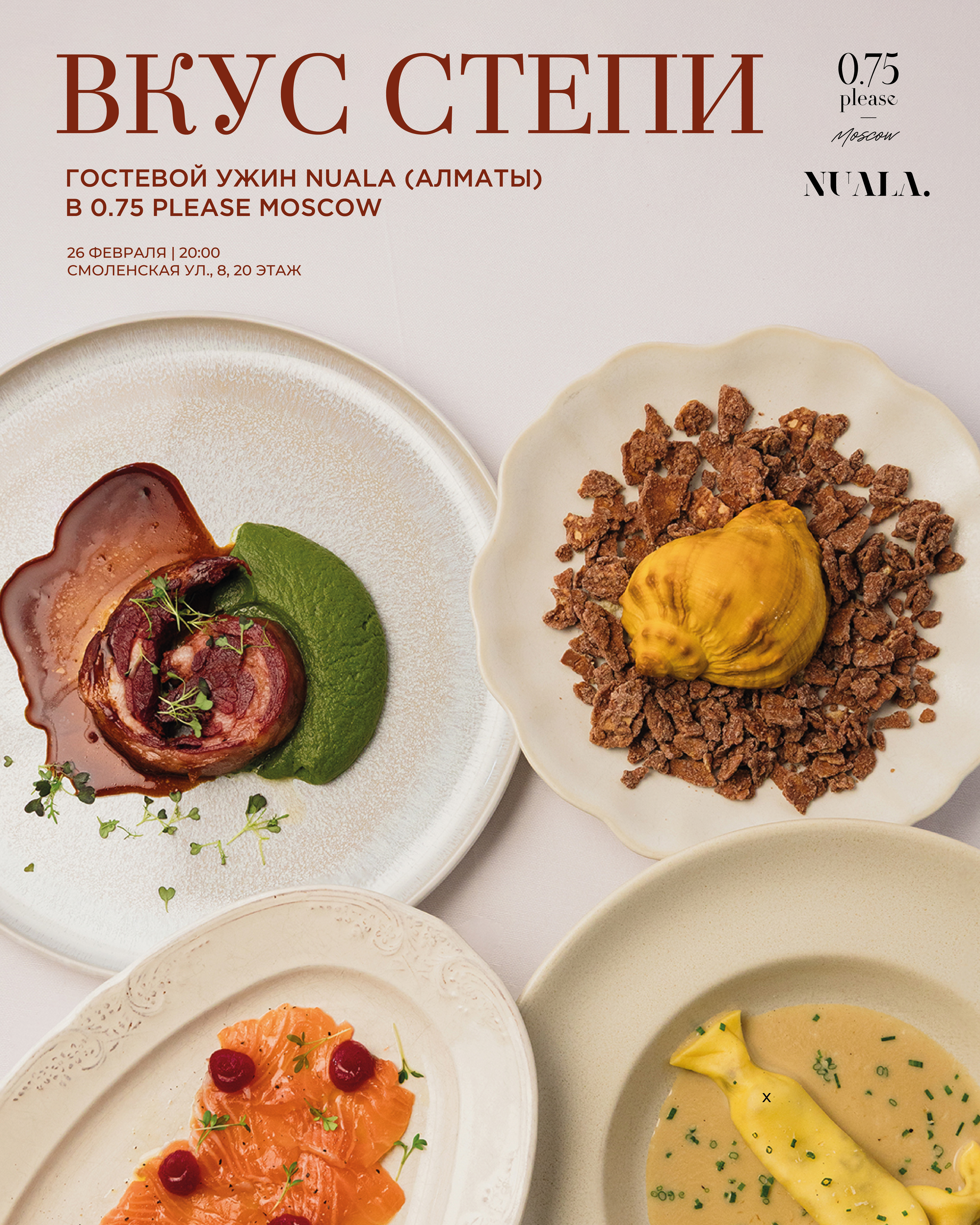 26 февраля в 0.75 please гостит шеф-повар казахстанского Nuala Тарас Корчагин. В 20:00 он подаст ужин из пяти курсов ресторана «Вкус степи», раскрывающий самобытный вкус Казахстана. В меню закуски с алматинским апортом: карпаччо из горной форели с яблочным гелем и тартар из конины. На горячее — карамель с казы, крем-пияз на конском бульоне с копчёным куртом и томлёная шея ягнёнка с кремом из печёной фасоли джандо и куртом из верблюжьего молока. На десерт — фирменный Nuala с лавандовым муссом и иримшиком. К каждому курсу шеф-сомелье Дмитрий Ковалев подобрал винную пару, включая редкие позиции, такие как казахстанский рислинг AK Arba 2016 Reserva и вино Арпачина из сорта Цимлянский Чёрный. Стоимость ужина — 6 000 ₽, винного сопровождения — 6 000 ₽, безалкогольного сопровождения — 3 000 ₽. Ресторан открывается строго к ужину, предварительная бронь обязательна, количество мест ограничено.