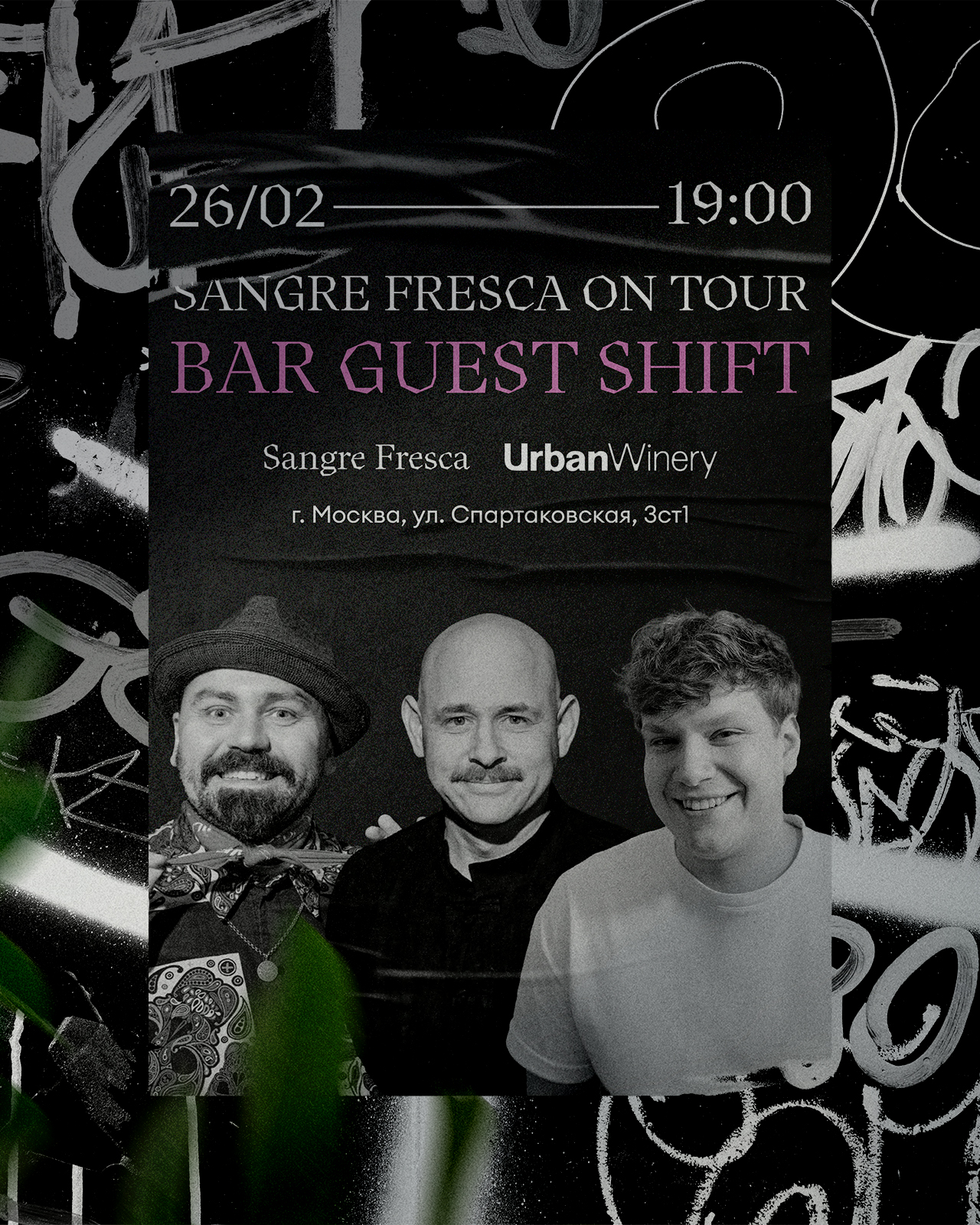 Барная команда Sangre Fresca продолжает серию гостевых смен в рамках всероссийских гастролей SangreFresca on tour 2024-2026. 26 февраля во главе с сооснователем проекта Николаем Николаевичем Киселёвым, бар-менеджером Иваном Пикулёвым и барменом Михаилом Григорьевым команда проведет гостевую смену в винном пабе Urban Winery на «Бауманской» в Москве, где гости смогут наблюдать за процессом создания вина вживую. Специально для вечера приготовлены авторские коктейли на основе вин Urban Winery, вдохновленные мексиканскими художниками. «Диего» (790 руб.) сочетает охмеленное вино UW-HOP Wipa 2.0., текилу на хмеле и сиреневый кордиал, отражая уверенность и лиричность Диего Риверы; «Посада» (790 руб.) строится на десертном вине UW-VNL, Campari, малине, красном базилике и апельсине, передавая иронию и точность Хосе Гуадалупе Посады; «Фрида» (790 руб.) с вином UW-PND, текилой на гречишном чае, ванилью, лимоном и Melonade создаёт многослойный, хрупкий внешне, но сильный внутри коктейль, как сама Фрида Кало.