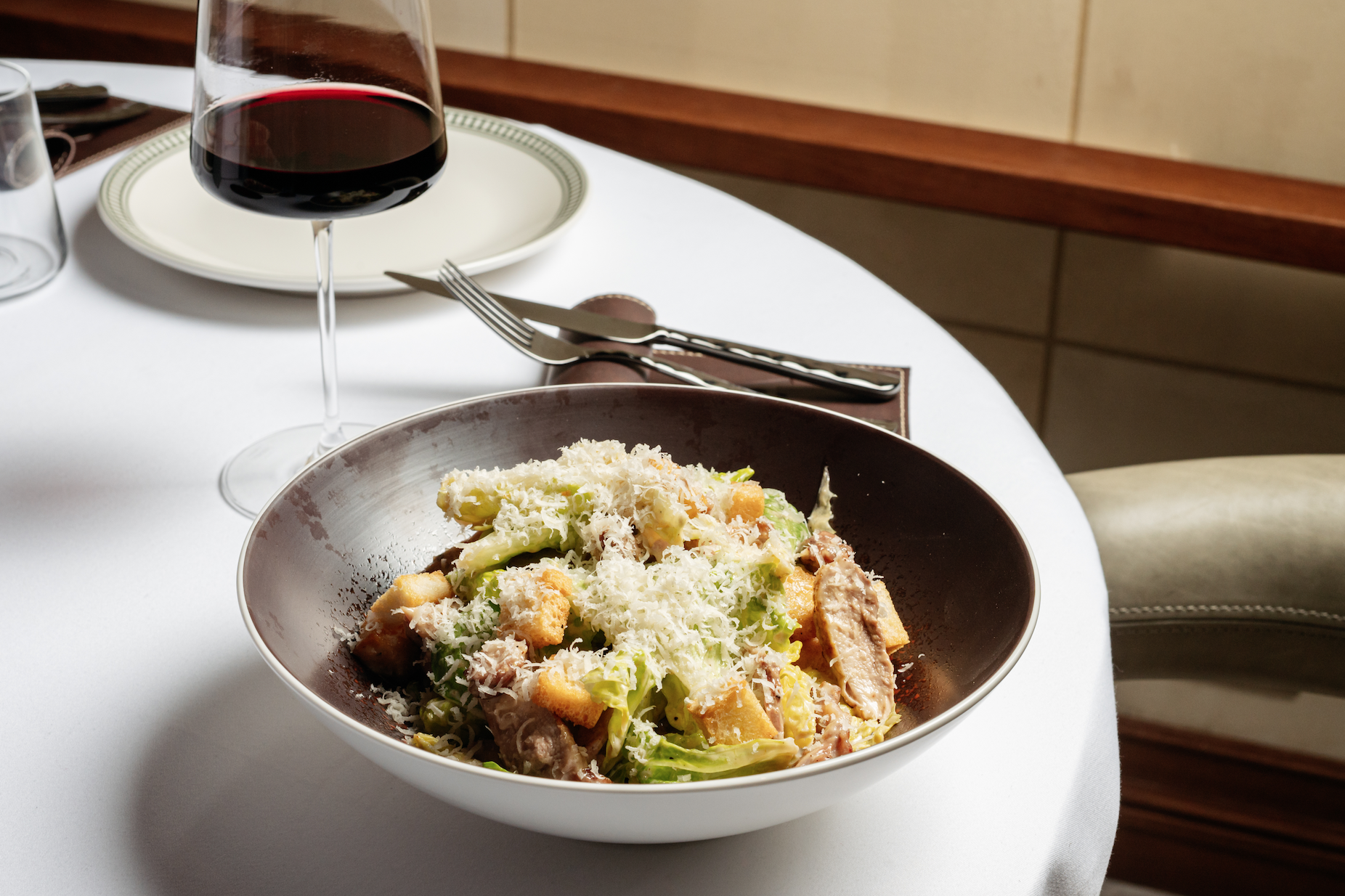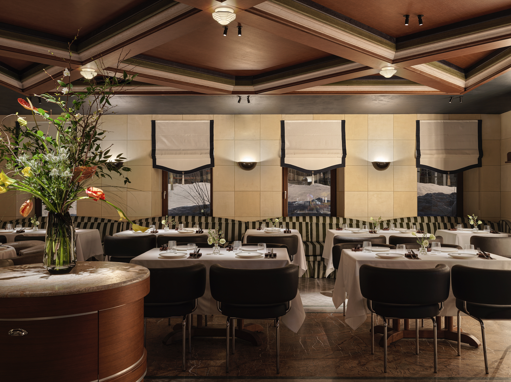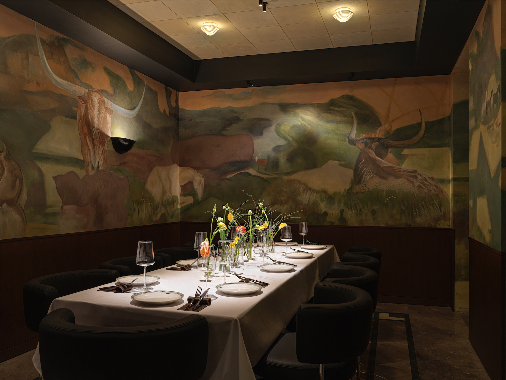 Интерьер, созданный Женя Ужегова, отсылает к баскским txoko — гастрономическим клубам с историей. Два зала предлагают разное настроение: камерный с большим столом и росписями и более строгий, напоминающий джентльменский клуб, с ритмичной геометрией и сочетанием дерева, камня и штукатурки.