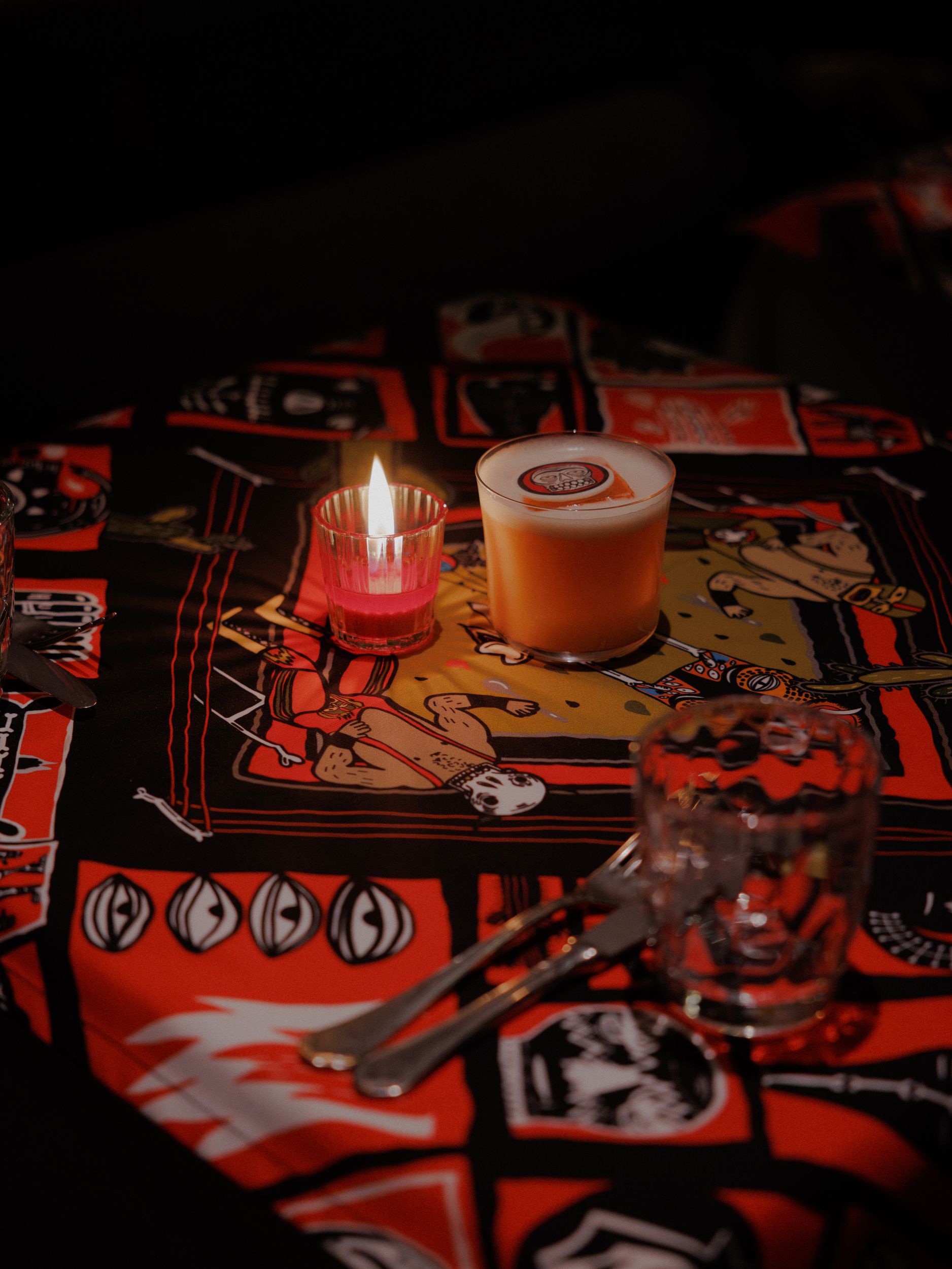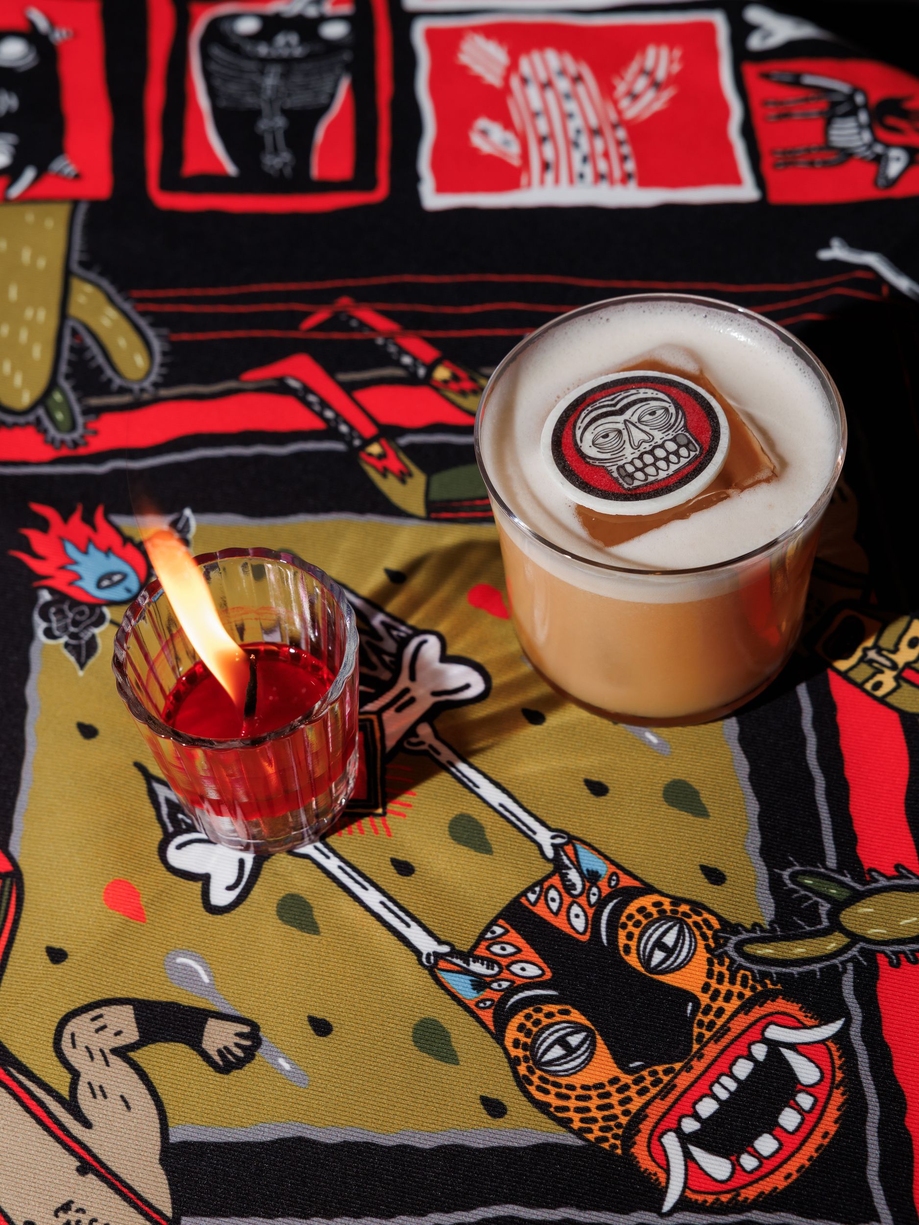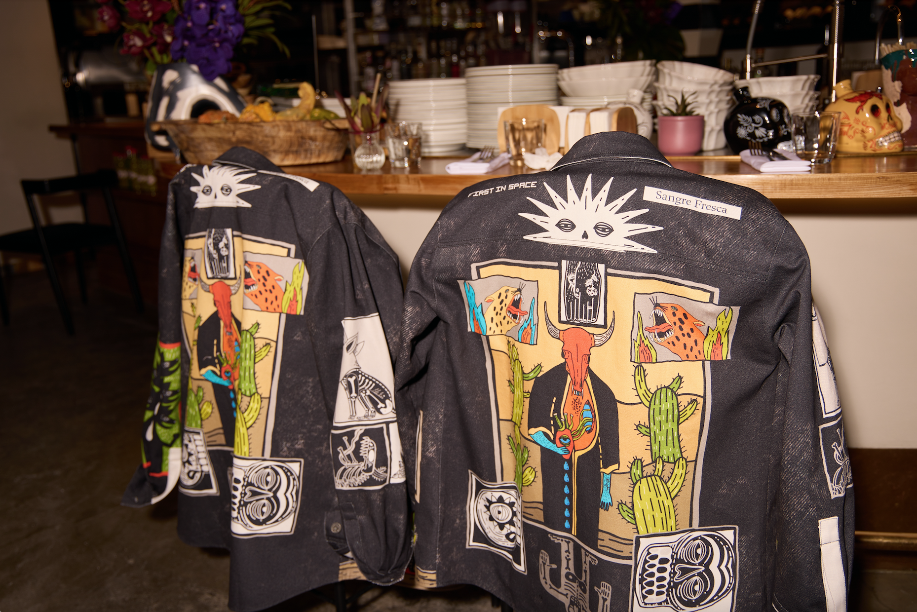 Sangre Fresca объединилась с дизайнерским брендом First in Space — результатом стала коллаборация, в которой гастрономия с мексиканским темпераментом встречается с модой, наполненной символами и визуальными кодами. В дроп вошли три ключевые позиции. Хлопковая футболка с вышитым шевроном-сердцем и принтом Девы Гваделупской на спине (6470 руб.) интерпретирует образ corazón как символ силы, страсти и внутренней энергии, а красный цвет отсылает к самому названию ресторана — «свежая кровь». Брюки прямого свободного кроя из 100% хлопка (13 500 руб.) объединяют фирменные мотивы бренда и мексиканскую образность: черепа, глаза и сердца складываются в единый визуальный ритм. Рубашка (14 970 руб.), представленная в мужской и женской версиях, продолжает тему огня и темперамента: рестлеры, кактусы, горящие сердца и vaca de lumbre формируют плотный, экспрессивный принт. Все изделия упаковываются в фирменный шоппер (1370 руб.), который также доступен отдельно. Коллаборация получила продолжение и в барной карте. Специально к релизу команда во главе с шеф-барменом Иваном Пикулёвым создала коктейль FIRST IN SPACE (900 руб.). В его основе — выдержанный ром, манговый ликёр, пюре гуавы, лимонный сок, солёная карамель и ангостура. Напиток раскрывается плотным пряным профилем с тропической глубиной и деликатной сладостью, а подача в рокс-кубе с сахарным черепом завершает образ, превращая коктейль в логичное продолжение визуального кода всей коллекции.