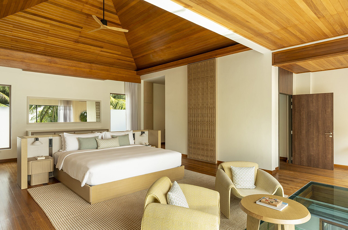 Интерьеры виллы разработаны сингапурским архитектурным бюро BLINK Design Group. Пространство выполнено в тёплой природной палитре с акцентом на чистые линии, натуральные материалы и орнаменты, вдохновлённые формами природы — волнами, пальмами и узорами песка. Для гостей доступен персональный помощник thakuru, который организует всё — от ресторанов и спа до морских прогулок и ужинов на отмели посреди океана.